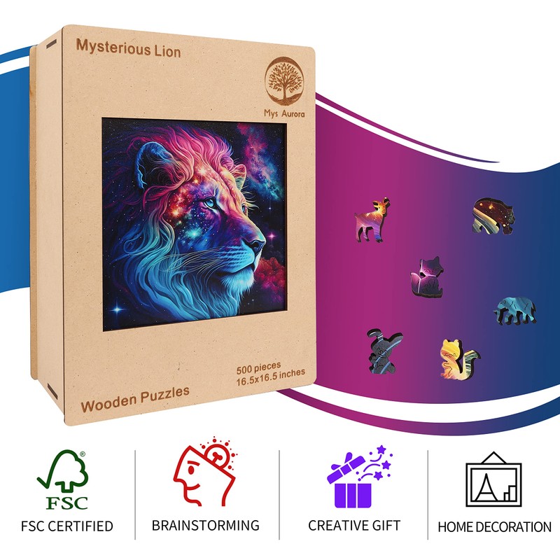 Mys Aurora Unique Wooden Jigsaw Puzzles - Starry Lion, 200 Pcs Medium Size 11.2'' x 11.2'', Luxurious Animal Shaped Wood Puzzle, Beautiful Package, Best Gift for Adults