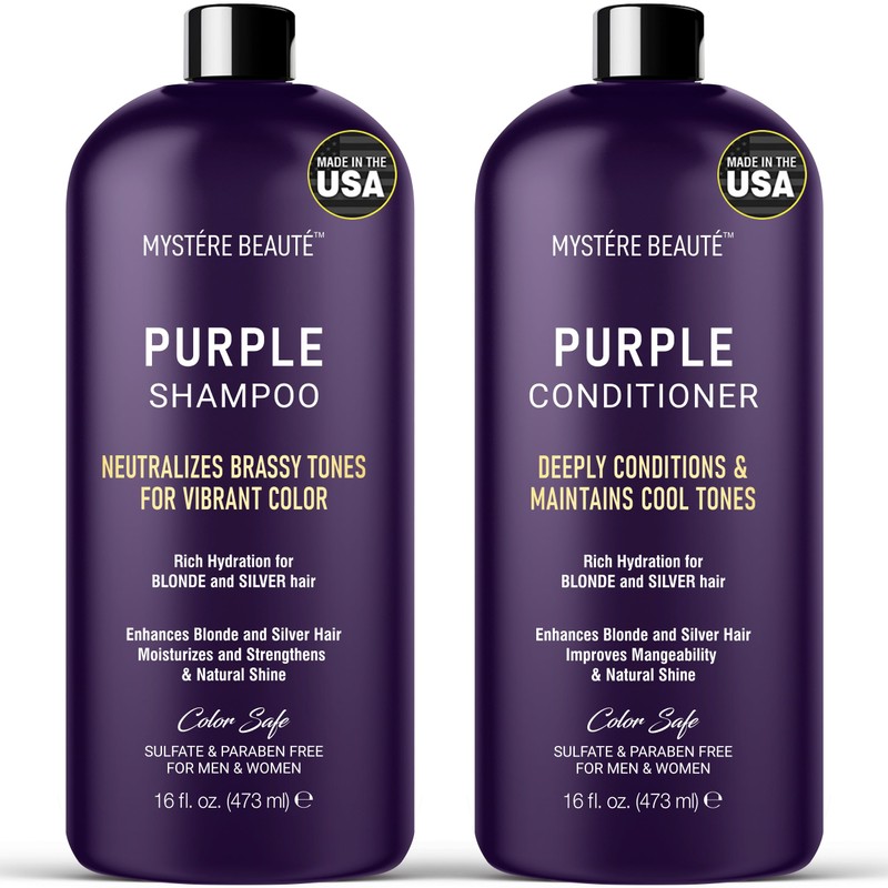 - Introducing our Purple Shampoo and Conditioner Set, perfect blonde shampoo and conditioner set for maintaining and brightening gray hair. Formulated with purified water, green tea leaf extract, orange extract, chamomile extract, silk protein, avocado oil, and vitamins B5 and E, this purple shampoo and conditioner for blondes nourishes and protects your hair while enhancing color. This shampoo and conditioner set purple is a must have for your shower.