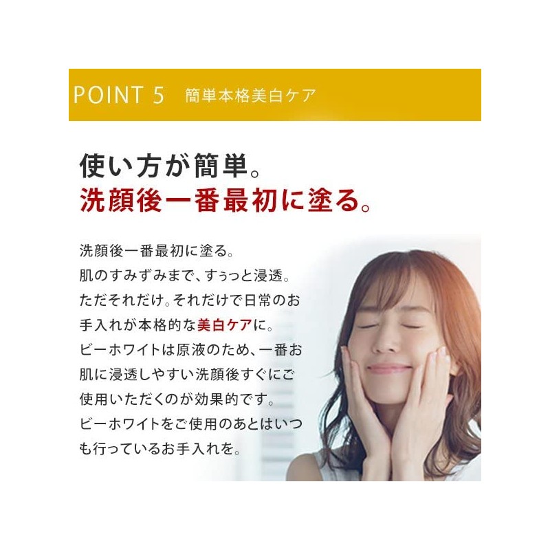For those who suffer from stains after using Bee White. Quasi-drug whitening serum Active whitening ingredient: This serum solution is primarily sourced from tranexamic acid, suppresses the production of melanin and prevents stains and freckles. Features First Application After Washing.