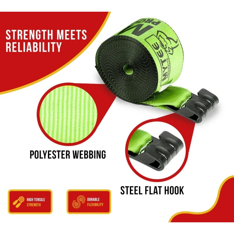 Introducing our 4" Winch Strap with Flat Hook - Safety Green, WLL 5,400 lbs Flatbed Tie Down Strap for enhanced visibility and improved cargo security. This safety green winch strap with a flat hook from Mytee Products can be used to secure loads on flatbeds or other hauling vehicles. Find the other essential details about this winch strap below: