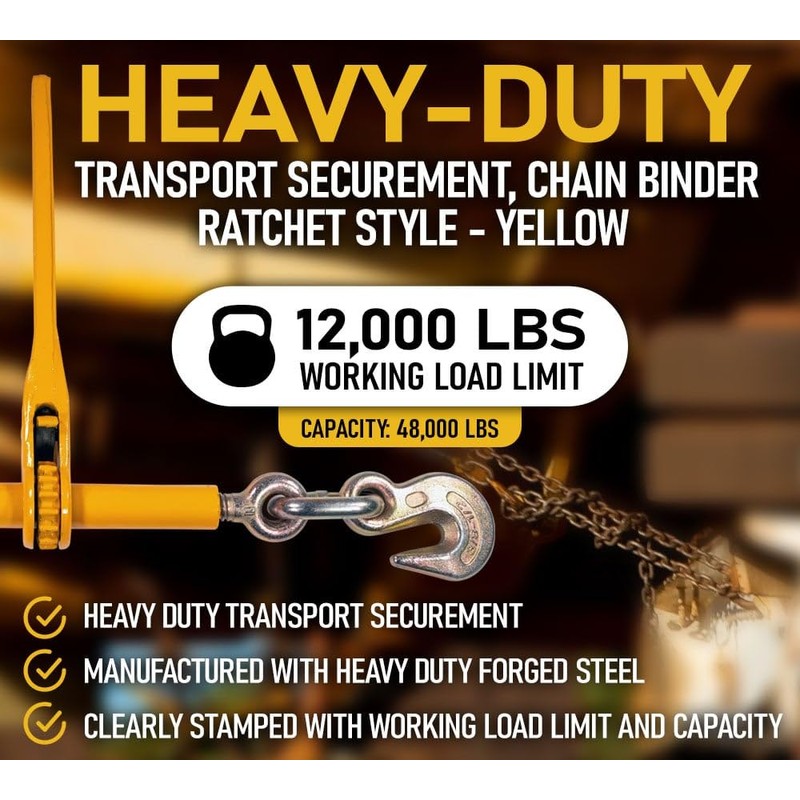 Mytee Products 3/8"-1/2" Heavy Duty Ratchet Lever Load Binder w/Grab Hooks 12,000 Lbs Working Load Limit - Yellow | Tie Down Hauling Chain Binders for Flatbed Truck Trailer