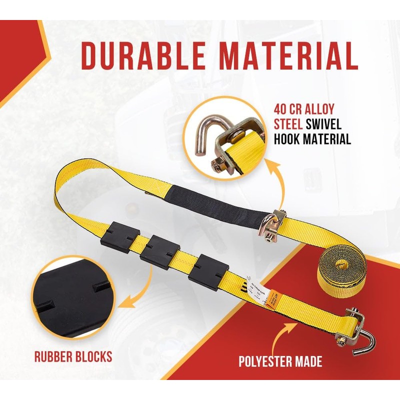 • Size: This strap measures 2 inches in width and 16 feet in length, providing ample length for securing larger tires or accommodating various tire sizes on trailers.