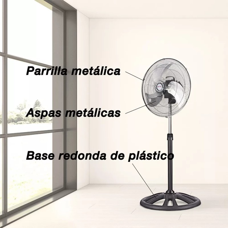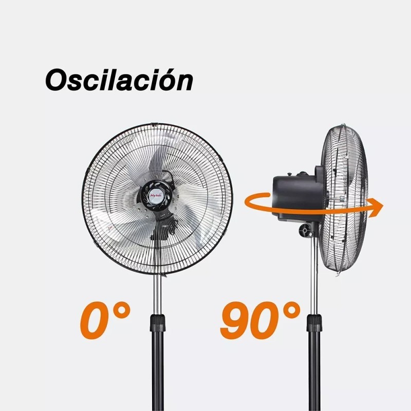 Ventilador de pedestal metálico modelo 3392 de 18 pulgadas, marca MYTEK, con oscilación de 90° para una amplia cobertura. Cuenta con 3 velocidades y altura ajustable de 88 a 131 cm para adaptarse a diferentes espacios. Su potencia de 85 watts proporciona un flujo de aire eficiente. Diseño práctico para un ensamble sencillo.
