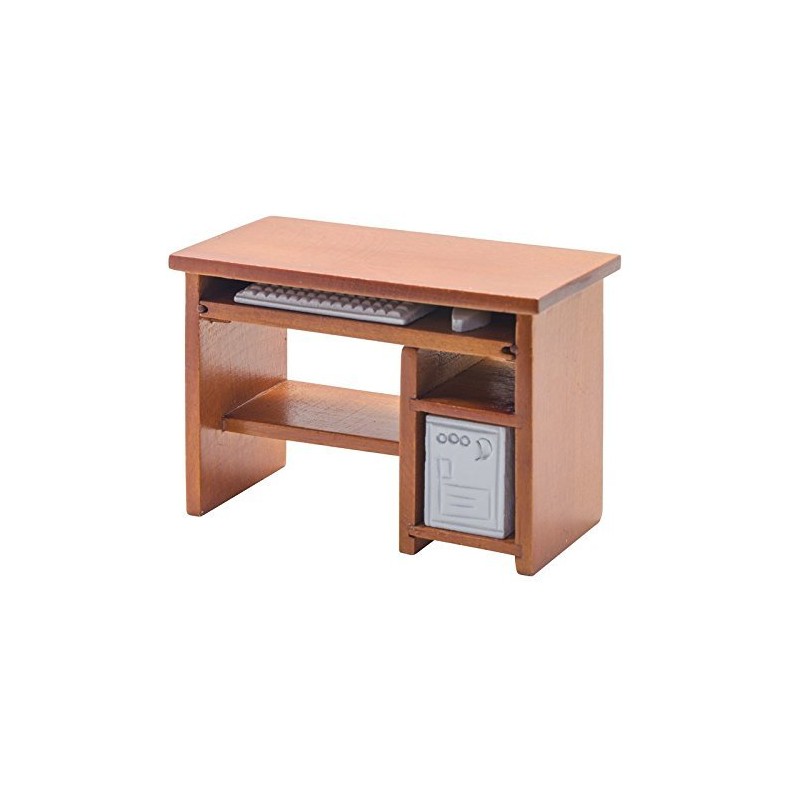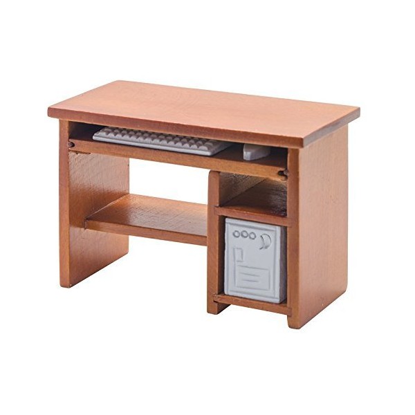 1/12th Scale Stained Wood Office Desk, with keyboard tray and tower. Keyboard tray on the office desk pulls out.