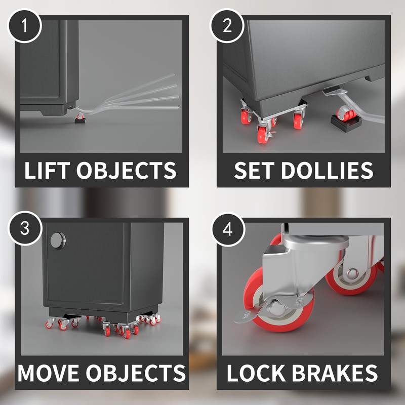 - [SECURITY PROTECTION]:The pry bar can be pasted with self-adhesive rubber anti-slip pads,which can prevent objects from falling off and protect them from being scratched when lifting them;4 self-adhesive velvet anti-slip pads are pasted on heavy furniture mover dolly panels,which can effectively keep objects from slipping during transportation.