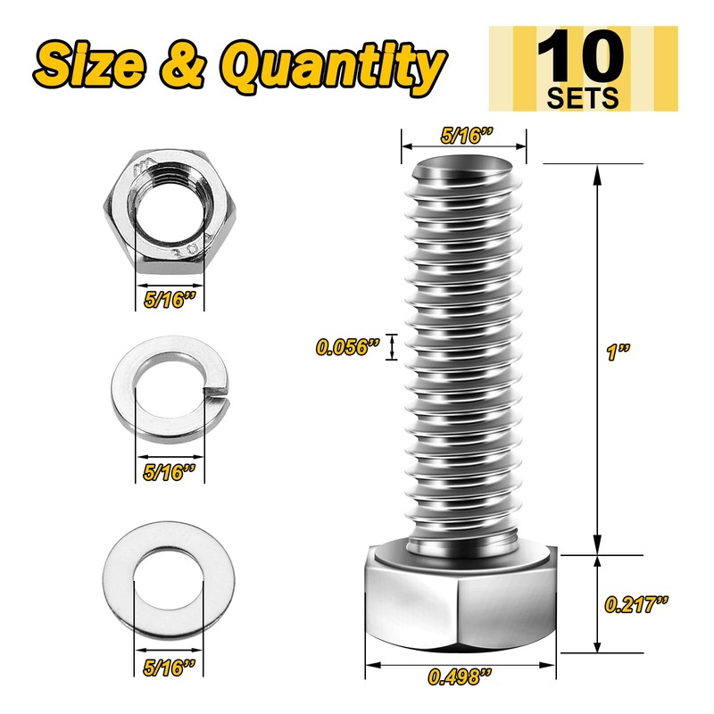 • PRODUCT NAME - 10 sets 5/16-18 bolt, with matched hex nuts, various sizes and precise threads for different usage. Package includes: 10 pcs 5/16-18x1" bolts, 10 pcs 5/16-18 Hex nuts, 10 pcs 5/16" flat washers,10 pcs 5/16" lock washers.