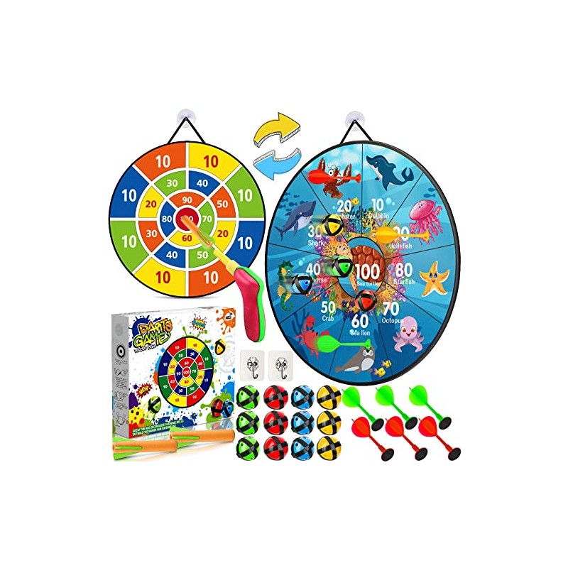 - Value set: dartboard children contains 66 cm double-sided animal dartboard, 12 sticky balls, 6 darts, 2 hooks and 2 sticky darts. Any age.