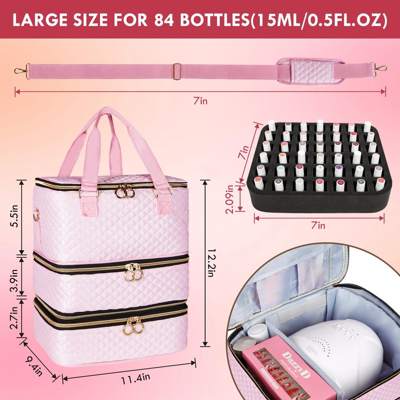 MZTXY MZTXY Nail Polish Organizer Bag Hold 84 Bottles(15ml/0.5 fl.oz), 3 Layers Nail Kit Supplies Organizer Bag Travel, Nail Organizers and Storage Case with Holder & Shoulder Strap, pink