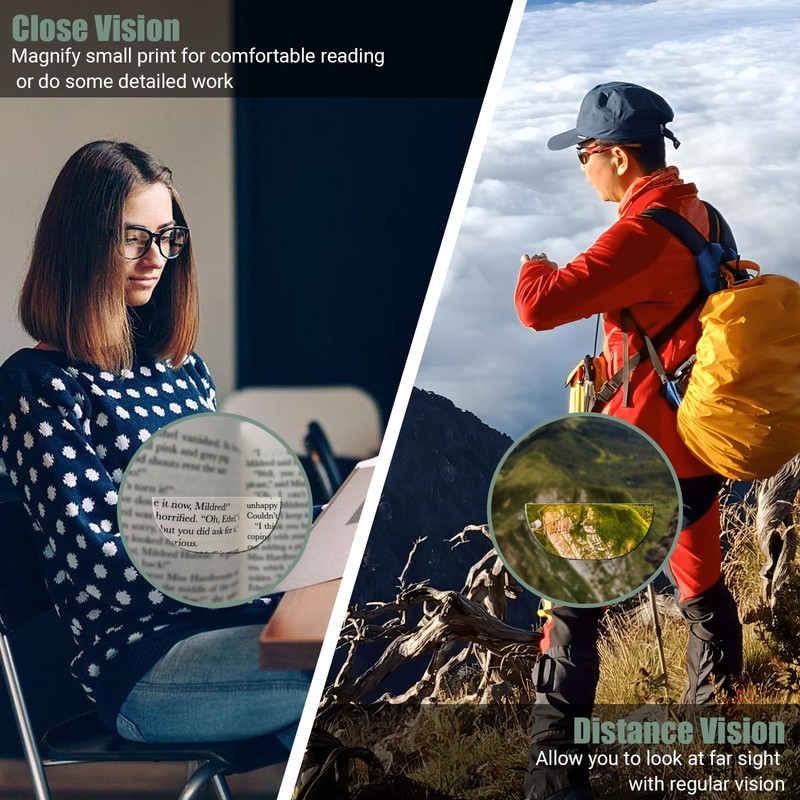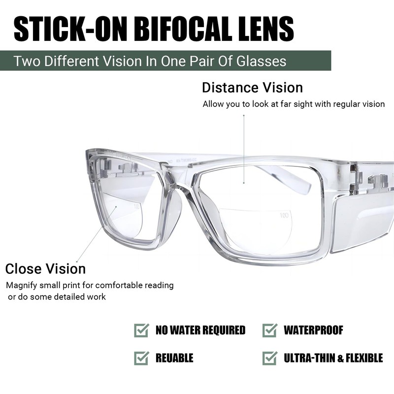 - Nearly Invisible, Clear View — Ultra-thin stick on bifocal lenses sit inside the lens with no bubbles or distortion; low-profile look.