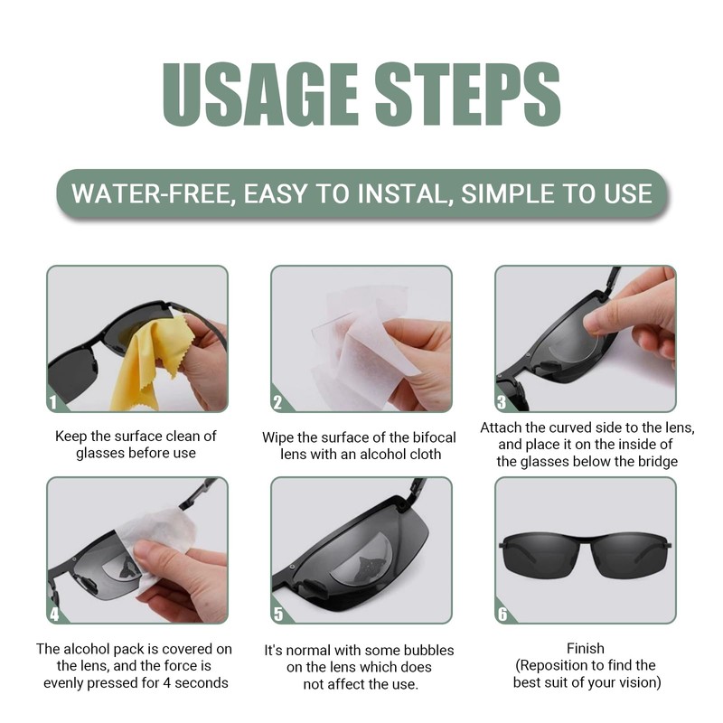 - Dry-Cling, No Glue — Press to apply, peel to remove; true peel-and-stick bifocals, residue-free and reusable.
