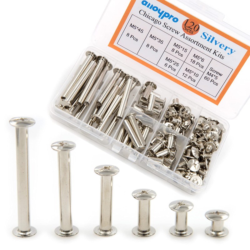 Alloypro 60 setsSilvery Phillips Chicago Screws Binding Book Screw M5 x 6/10/15/25/35/45mmPackage Quantity: 120pcs (60Pair)- M5 x 06mm - 18pcs- M5 x 10mm - 12pcs- M5 x 15mm - 08pcs- M5 x 25mm - 06pcs- M5 x 35mm - 08pcs- M5 x 45mm - 08pcs- 5mm Tops----60pcsNotes: Small parts. Not for children under 5 years old.