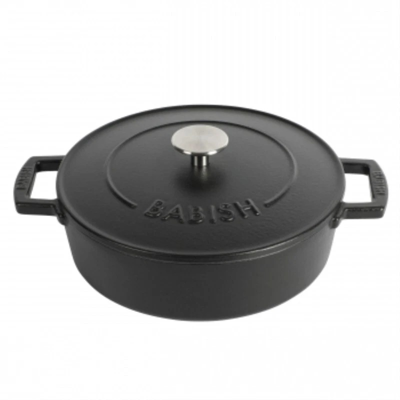 A kitchen heavyweight in multi-functionality and durability, the Babish 3-quart Cast Iron Braiser with Lid stews, roasts, slow-cooks, bakes, and wows family and friends with delicious meals. Constructed from durable cast iron with an enamel interior, it heats up evenly and brings out natural flavors for tender, juicy, melts-in-your-mouth results. The ridged lid allows continual self-basting to collect moisture and redirect it back on the food. Pop this braiser in the oven using the sturdy handles for a safe and confident grip when lifting and serving. Safe to use on all kinds of stovetops, this cast iron braiser is a one-pot champion to turn veal shanks, pork loins, and more into tasty dishes. Oven safe up to 500°F. Hand wash recommended.