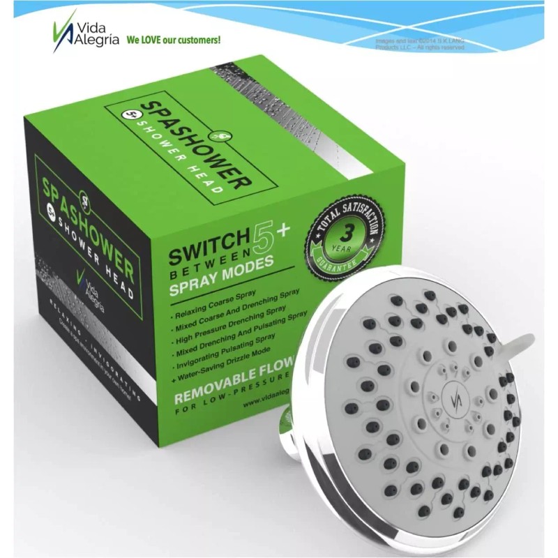 Vida Alegria 5-Inch Spashower High Pressure Shower Head; 2.5 gpm, 5 Sprays + Water-Saver (Chrome)