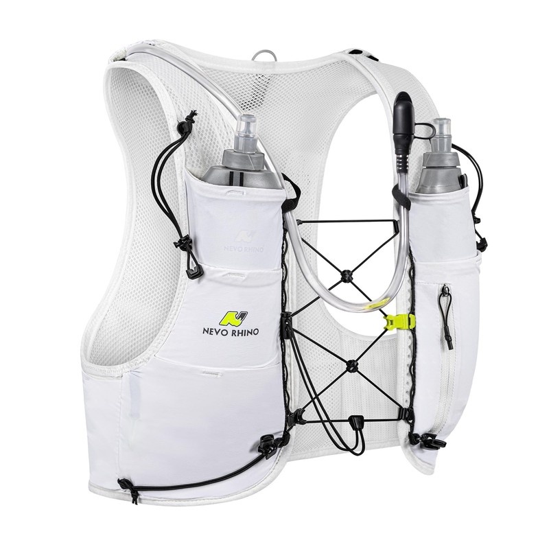 - OPTIMAL HYDRATION:N NEVO RHINO hydration running vest crafted from durable nylon,this running water backpack weighs only 7.8–8.5 oz (220–240 g) for sizes S to XL.Designed for comfort, it features soft 3D mesh fabric and a stable unisex fit.With 5L of streamlined storage,it holds all your gear without bulk—ideal for fast,comfortable trail running