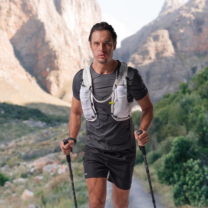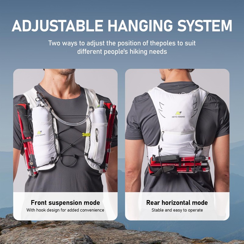 - VERSATILE HYDRATION VEST:Hydropack included 1.5L water bladders + 2×500ml leakproof TPU soft flasks.Maintain optimal hydration during endurance runs with quick-draw spouts and dust-resistant ports.The trekking poles feature three simple and convenient locsms.This lightweight running vest water bottle comfortably holds all your running essentials—water,phone,keys,and nutrition—so you can focus on your sportsrrrrrr