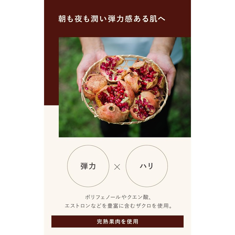 - Generally rich in polyphenol, citric acid, and estron, this pomegranate is known as the fruit of women since the ancient times. It is thick enough to ripe. Made with pomegranate from Wakayama with a focus on being harvested in a firm ripe. Formulated with pomegranate fruit extract that is carefully extracted at low temperatures for 1 week. 1 Moisturizing ingredient
