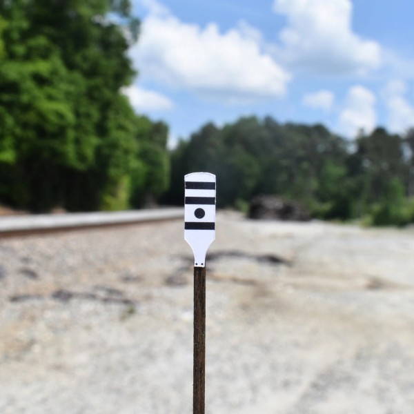 Add authentic Southern charm to your layout with this Southern Railway Whistle Post , faithfully modeled after the classic trackside signs used throughout the Southeast. Featuring the distinctive black-and-white striped pattern with a central dot, this sign instructed engineers to sound the whistle as they approached grade crossings.
