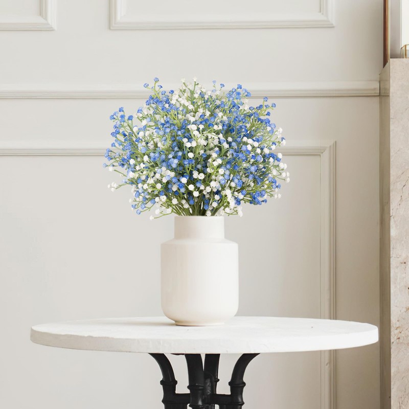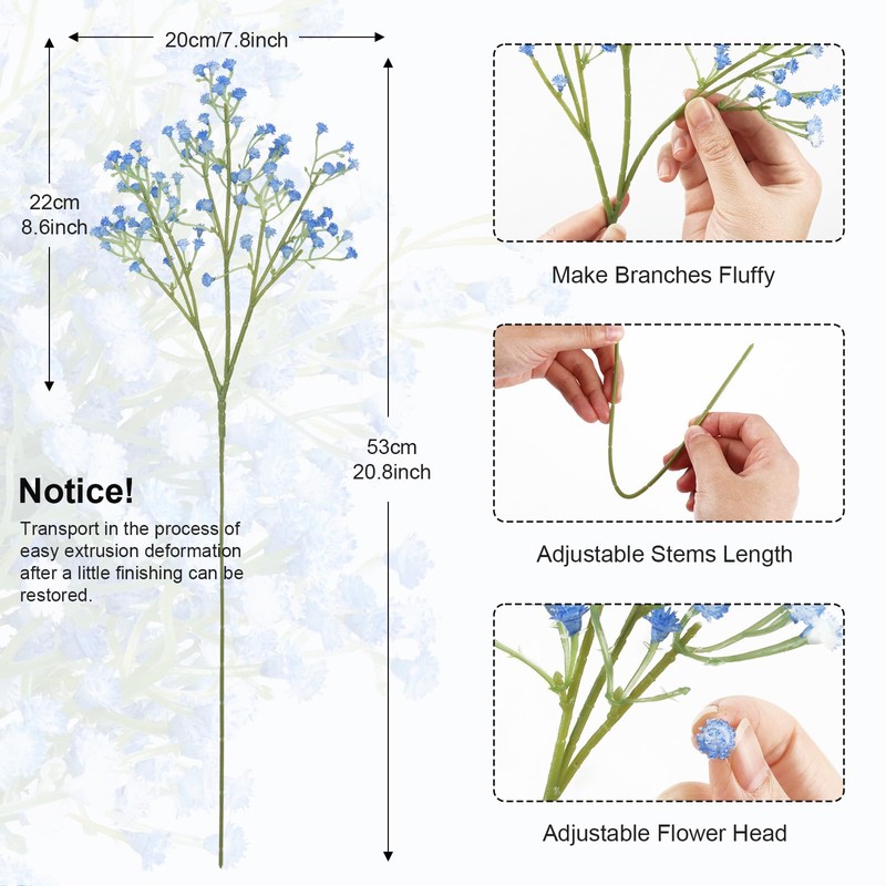 - High Material: Mix blue and White babys breath artificial flowers are made of high quality PU, flower head is silica gel, green plastic stem, looks lifelike and has a real touch. The stem can be bent or cut as required. The sturdy stem with luxuriant foliage, suitable for most vases.