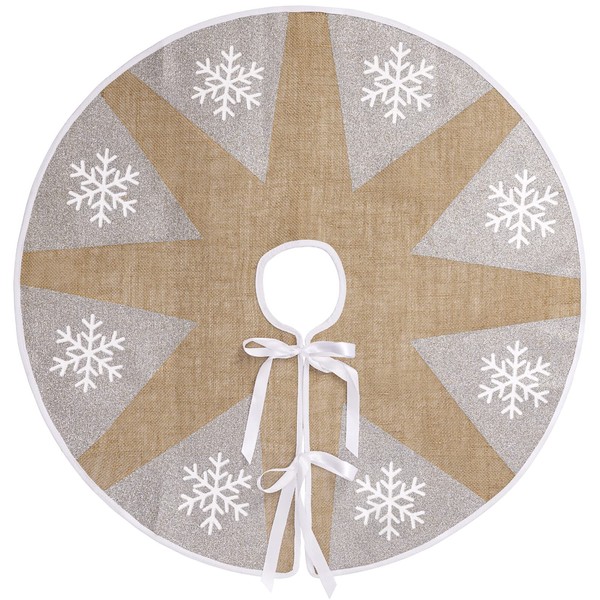 - Material: 100% High quality natural burlap and white snowflake printed design, durable and lightweight. This countryside burlap tree skirts can add to your Christmas atmosphere.