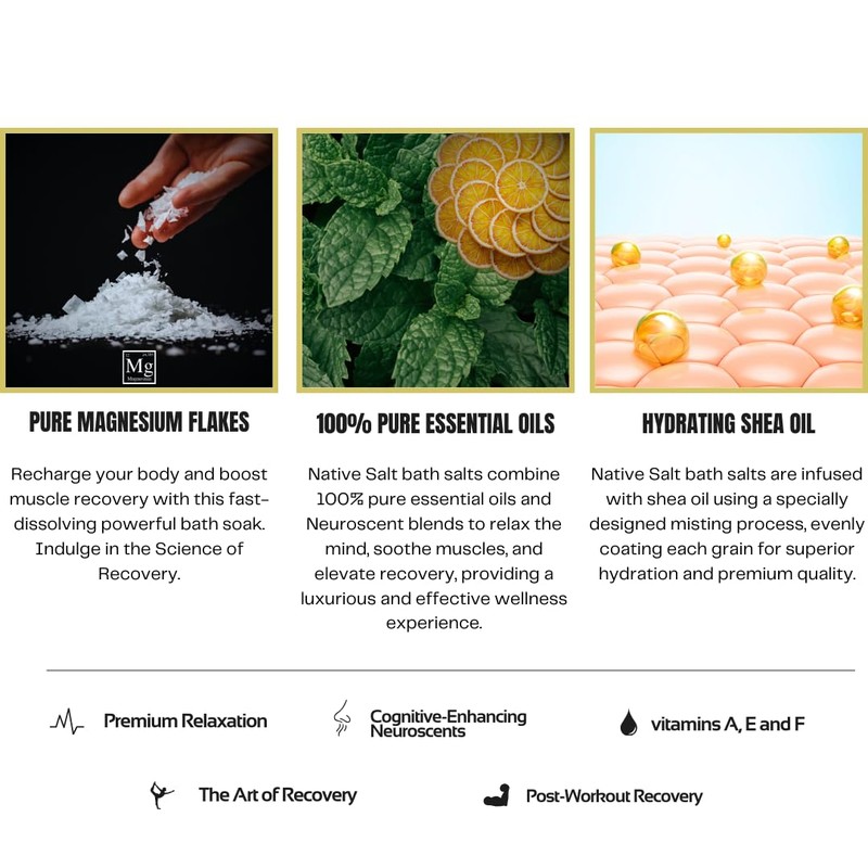 - EXPERIENCE THE ULTIMATE IN RECOVERY AND RELAXATION with Native Salt's premium magnesium bath salts. Our fast-absorbing magnesium flakes Infused with shea oil for a luxurious soak.