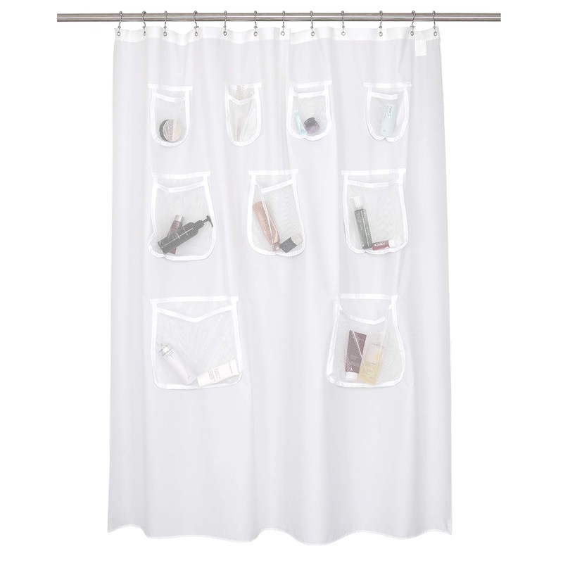 - Mesh Pockets Bath Organizer: Keep your favorite shower accessories close at hand with this shower curtain with 9 pockets