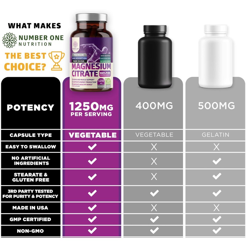 - SUPERIOR PURITY FOR STRONGER BONES. N1 Nutrition's Magnesium Citrate is an all natural supplement to help you maintain and strengthen your bones. It comes in an easy to swallow capsule with 250MG of elemental magnesium per 1250mg serving with the highest bioavailability.