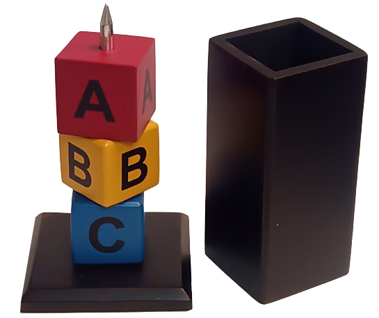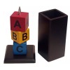 It is no secret that I love well made Close-Up props, I had this set made to my specifications and they turned out really nice. Deep dark, rich lacquer, quality product. Perfect for your next close-up performance! There are many routines and presentations that are possible with this wonderful effect! Three wooden blocks labeled "A,B, & C" and a square tube are shown. Block "A" is removed and placed in a hat. The remaining two blocks are covered with the tube. The audience is asked the location of block "A". Naturally they say "in the hat" and you remove the block to show that they are correct. The tube is also lifted to show the position of the remaining two blocks. Now for the magic. Block "A" is placed on top of the other two blocks and the entire stack is covered with the tube. The audience is now asked the position of Block "B". No matter their response they will be wrong. The tube is lifted and block "B" is gone even though it was between two other blocks. You then reach into the hat and remove block "B". This is a true mystery. Carefully crafted from wood. This set also allows for the reverse effect where Block B is removed from the stack and then vanished using your favorite method. It then appears between the two others in the stand. Given the small size you are able to work without the wooden square tube and just make the magic happen in your hands. So many possibilities. Supplied with written instructions. the cubes measure approx. 1 3/8" and the prop from table to the tip of the center rod measures approx. 5.5" |