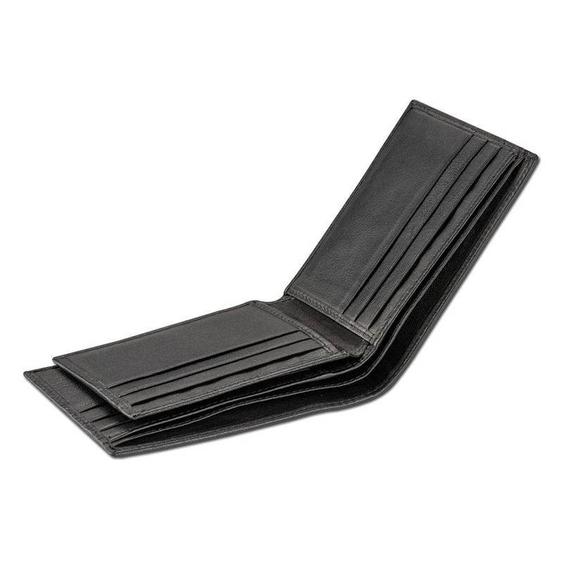 Pliable pebbled leather will adjust to more than one card in each of the 9 card slots. Three hidden compartments let you slide in paper receipts, more cards, or anything you want to keep out of view. Your ID is safely placed on the “flip out” part of the bifold wallet. 2 full length bill compartments with stylish black on black stripes interior lining.