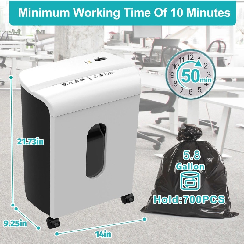 Convenient Design & 5 Minutes Shredding: With 5 minutes Non-Stop Shedding, overload operation of the Home shredder machine will Auto start overheating protection with 50 munites cooling time. It include 3-mode control switches (FWD, Power and Auto reverse functions simplify shredding and paper jammed clearing processes