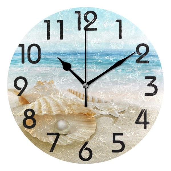 Naanle 3D Stylish Beautiful Summer Beach Seashell with Big Pearl Print Round Wall Clock Decorative, 9.5 Inch Battery Operated Quartz Analog Quiet Desk Clock for Home,Office,School