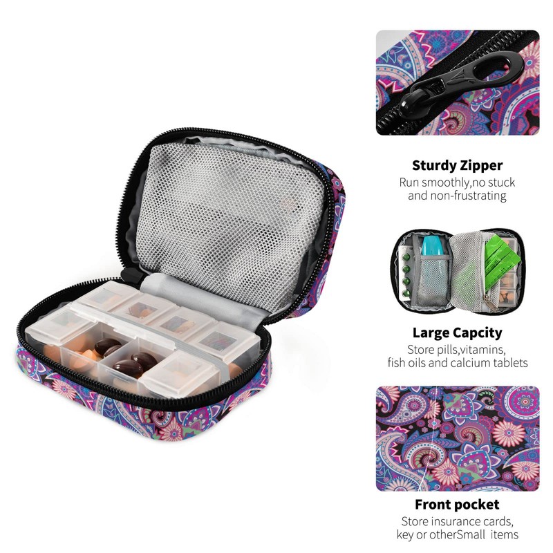 Naanle Traditional Paisley Flowers Pill Box 7 Day Case Travel Organizer Bag with Zipper Floral Portable Weekly Compact Size for Vitamin Supplement Holder, 4.6 x 3.14 x 1.88 Inch, Purple