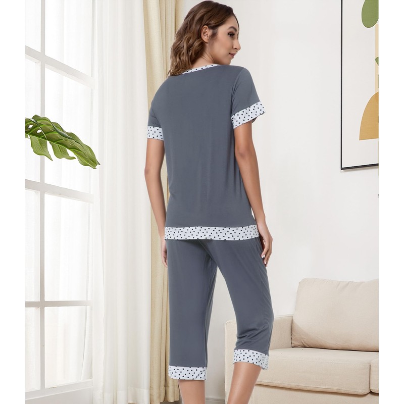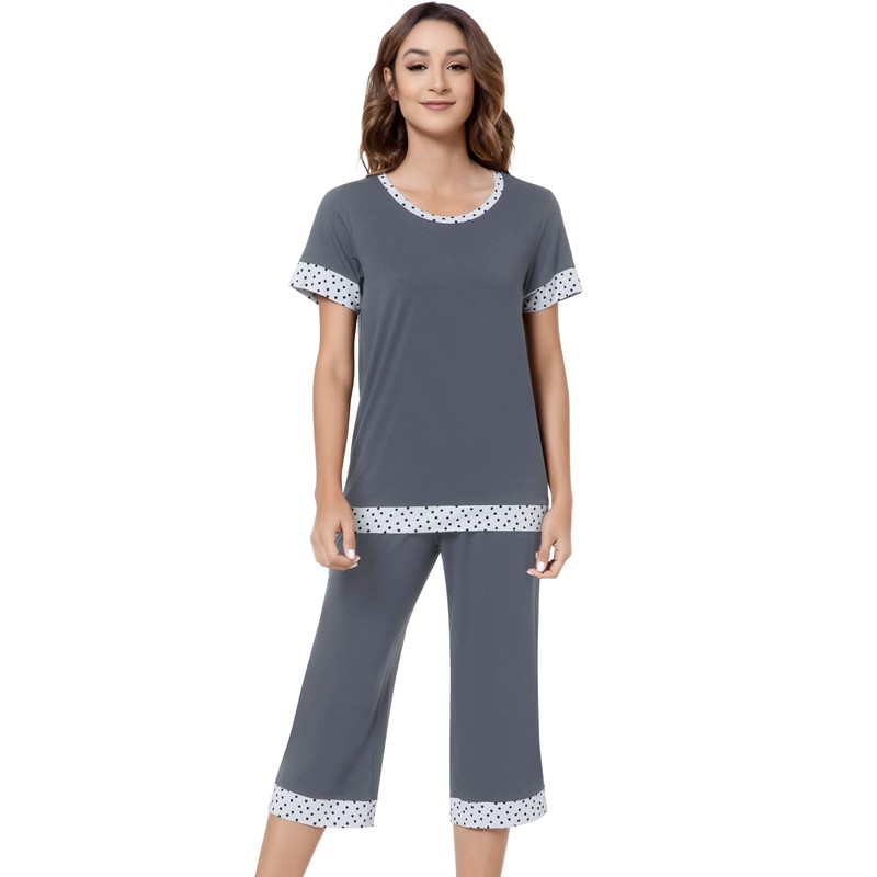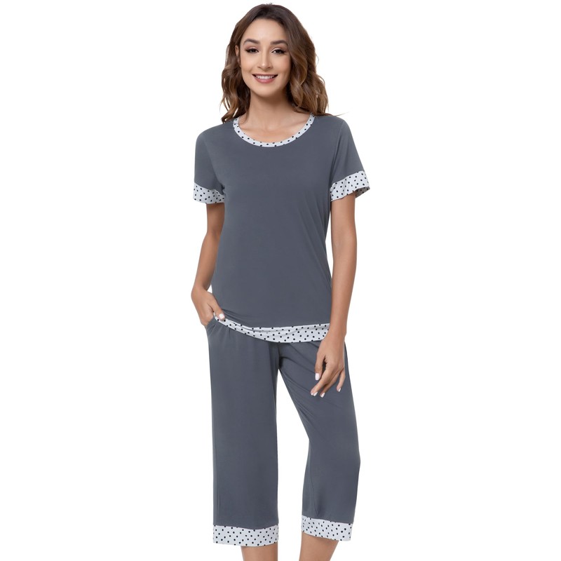 - [Fashion Design]: 2 piece pjs top features round neck,short sleeve,wave point contrast color design at neckline and hems. Capri pants with elastic waistband and wave point print at hems,casual pjs set for a relaxing day or night.