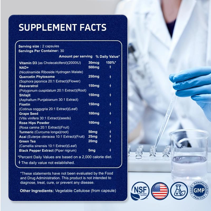 NAD+ 1500mg Supplement, with Resveratrol, Quercetin & Fisetin, Supports Skin Aging, Cellular Repair, Energy & Focus Support, Immunity Support, Triple Revive System for better absorption,60 Capsules:_1 Bottle (1 Month Servings)