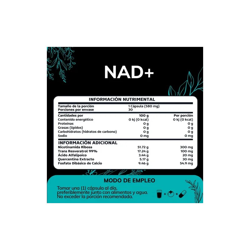Nad+ | Nr Nicotinamida Ribosa Con Trans - Resveratrol 99%, Ácido Alfa Lipoíco, Extracto De Quercetina, Fosfato Dibásico De Calcio | 30 Cápsulas
