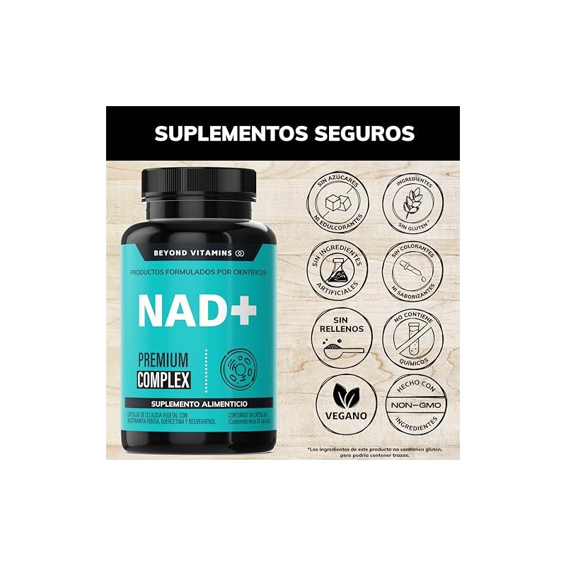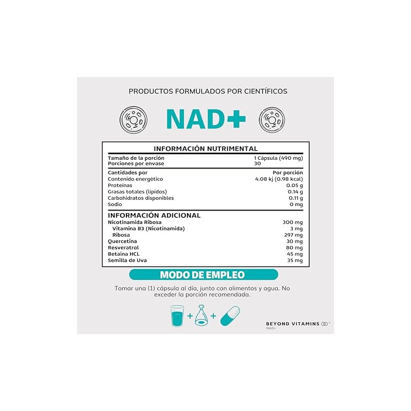 NAD+ | NR Nicotinamida Ribosa potenciado con Resveratrol, Quercetina, Betaina HCL y Semilla de Uva | Suplementos Beyond Vitamins | 30 días.