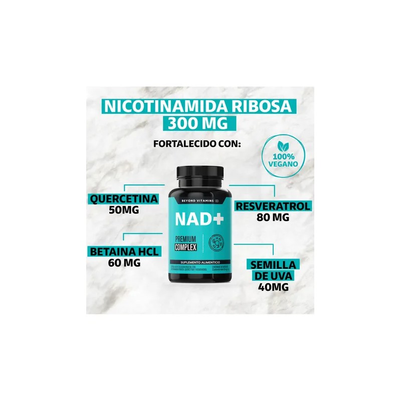 NAD+ Beyond Vitamins contiene una combinación completa Nicotinamida Ribosa, Quercetina, Resveratrol, Beatina HCL y Semilla de Uva. Nuestro producto son el resultado de investigación y estrictos estándares de control de calidad. Es ideal para hombres, mujeres y personas mayores. Nuestro NAD+ es libre de lácteos, soya, hormonas, antibióticos, conservantes, azúcar, colorantes y sabores artificiales. Es VEGANO.