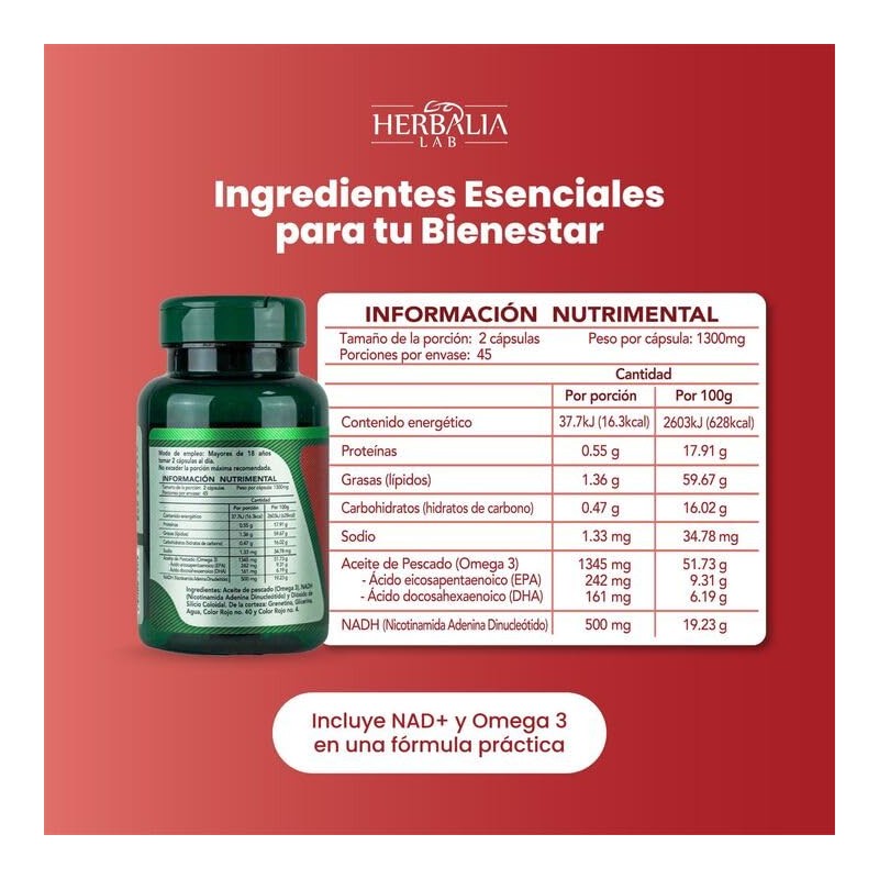 Acerca de este artículo NAD+ de Alta Potencia para Energía Celular: Formulado con 500 mg de NAD+ por porción, este suplemento apoya los procesos celulares clave, brindando un impulso a la producción de energía y al metabolismo. Apoyo al Envejecimiento Saludable y la Vitalidad: El NAD+ es reconocido por su papel clave en la reparación celular y el mantenimiento de la vitalidad, lo que lo convierte en un aliado ideal para un envejecimiento saludable. Aceite de Pescado Purificado y Seguro: Derivado de aceite de pescado de alta calidad, este suplemento está libre de contaminantes, garantizando un consumo seguro y limpio para quienes buscan los beneficios del Omega 3 sin riesgos. Mezcla de Omega 3 con EPA y DHA: Herbalia Lab NAD+ también incluye 242 mg de EPA y 161 mg de DHA, dos ácidos grasos esenciales que promueven la salud cardiovascular, cerebral y visual, contribuyendo al bienestar integral.y conservantes artificiales. Cápsulas Blandas de Fácil Consumo: Las cápsulas blandas de 1.3 g están diseñadas para una absorción más rápida y cómoda, facilitando la suplementación diaria sin complicaciones. Suplemento para el Bienestar Integral: Al combinar NAD+ con Omega 3, este producto apoya múltiples aspectos de la salud, desde el funcionamiento celular hasta el bienestar cardiovascular, asegurando un soporte completo para un estilo de vida activo y saludable. Suministro para 45 Días: Con 90 cápsulas por frasco, Herbalia Lab NAD+ con Omega 3 proporciona una dosis diaria continua y efectiva para apoyar la salud durante un mes y medio.