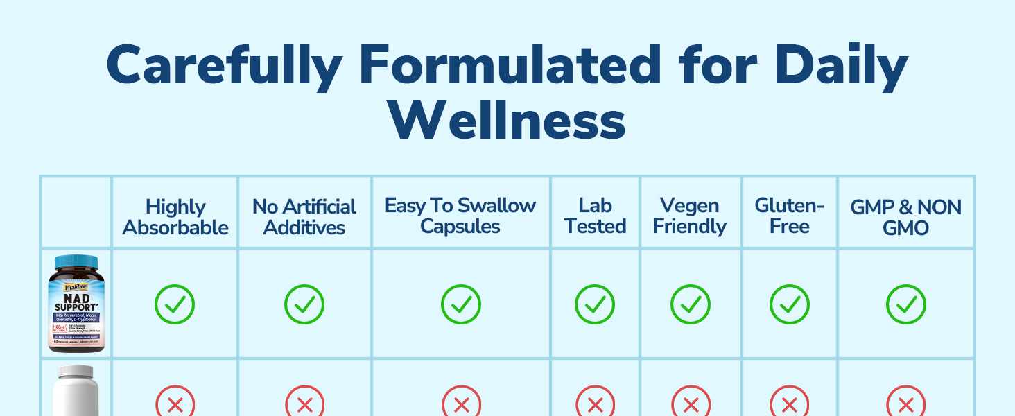 • Made With You In Mind: Combining nature’s nutrients with science-backed formulas, we create our first line of clean NAD supplements to help you make confident choices for your health. We are proud to affirm all Vitalibre products are manufactured in the U.S in facilities that adhere to strict Good Manufacturing Practices (GMP) guidelines