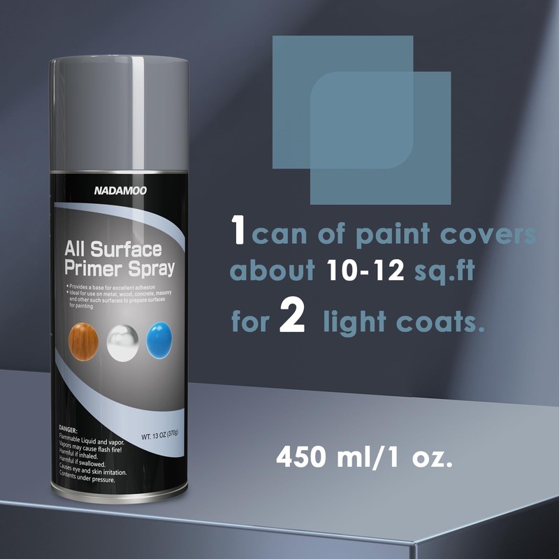 - NADAMOO primer spray paint contains modified epoxy resins, which has exceptional adhesion and enhances the materials’ ability to resist corrosion, and chemical damage,making it ideal for demanding applications. As a result, the lifespan of the coated surface is prolonged, reducing the necessity for frequent repairs or recoating. Again, this translates to cost savings and a longer-lasting, more durable finish.