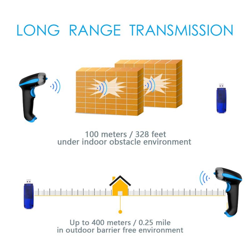 **Long Range Transmission** Compared to 2.4GHz wireless scanner, our scanner has the advantage of strong signal and long transmission distance,singal penetrates walls, ceilings and floors more effectively.