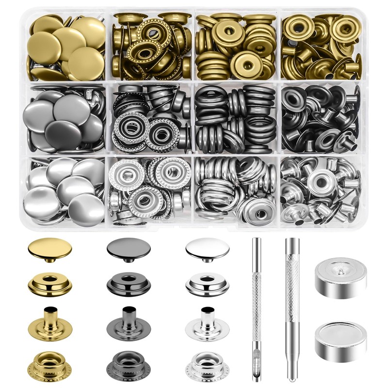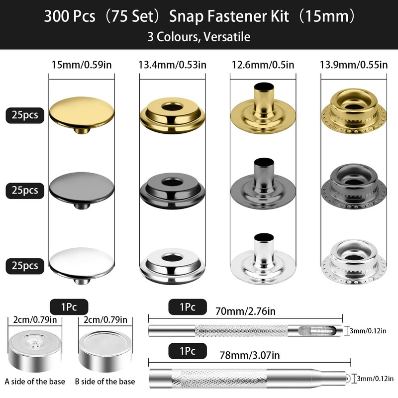 - 【300pcs 15mm Press Stud Kit】Includes 75 sets of metal snap fasteners. Caps are approximately 15mm/0.59 inch in diameter, comes with 1 x hole puncher, 1 x 201 Convex Tool, and 1 x round base), 1x 12-compartment storage box for easy portability and storage, one set is enough for your daily use.