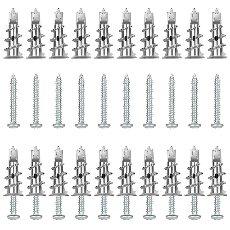- No pre-drilling: plasterboard dowel with screws self-drilling mechanism makes installation simple and uncomplicated without having to pre-drill holes beforehand. Simply insert on the cross bit on the cordless screwdriver and turn into the drywall. Super easy.