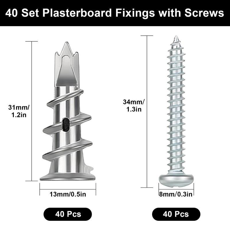 - 80 pieces plaster dowels & screws: Our clear box contains 40 plasterboard anchors and 40 self-tapping screws that fit perfectly and correctly, saving you time searching for.