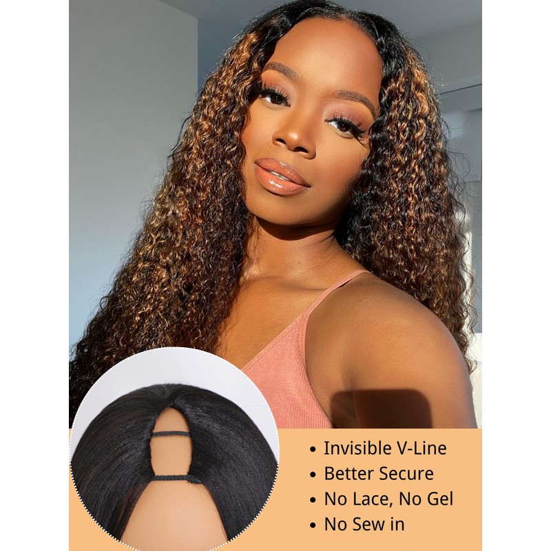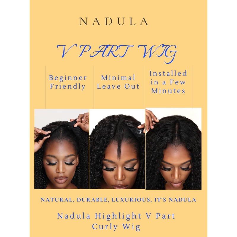 Nadula Highlights EasiContour V Part Wig Jerry Curly Glueless Human Hair Wig Transform your look effortlessly with the Nadula EasiContour V Part Glueless Wig, designed for those who value style and convenience. Made from 100% pure human hair, this Jerry Curly wig provides a soft, smooth texture that can be dyed, permed, or styled to match your personal flair. Our upgraded V-Line EasiContour design features seamless edges, creating a realistic hairline that blends beautifully with your natural scalp. This wig is perfect for beginners, allowing for minimal leave-out without the hassle of glue or sew-ins. with an adjustable elastic drawstring and five secure clips, this glueless highlights brown v part wig offers a comfortable fit for most head sizes (22-22.5 inches). Whether you're heading to the gym, out for a quick errand, or attending an unexpected meeting, simply clip it in for an easy, stylish look. Elevate your hair game with Nadula—where quality meets convenience!