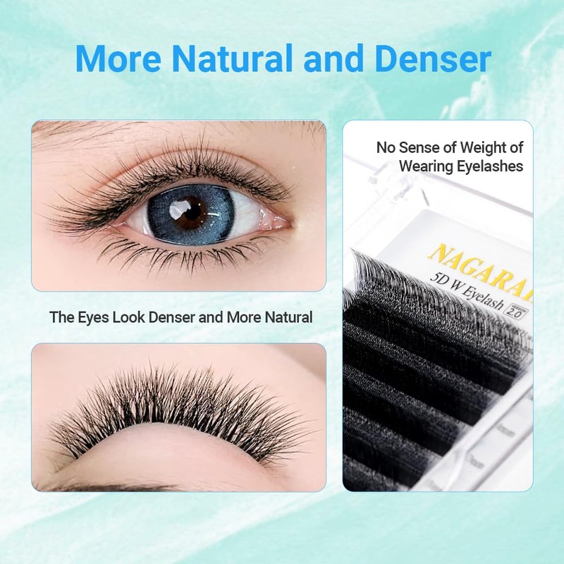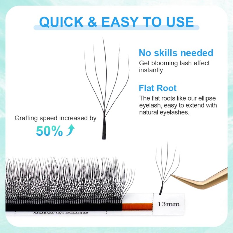 - Stronger binding and hold: compared to individual eyelashes, these pre-made W-shaped fans have a long stem that can increase the contact area with natural eyelashes. It can be better integrated with adhesive and the comfort for the guest is improved