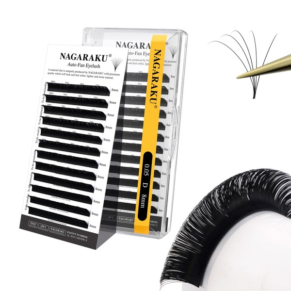 NAGARAKU Easy Fan Eyelash Extension, 2 Layers, Self-Fanning Volume Eyelashes, 2 ~ 20D Volume Technology, Blossoming Tuft, Car, Self Fanning, Fluffy Lash, Soft, Natural, Save Time, Black (0.05 D 8 mm)
