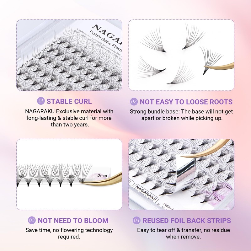 - 3. Stable curls: pre-made fan eyelashes are made of high quality PBT material, which is very soft and lightweight. The exclusive material and craftsmanship of NAGARAKU ensure that the eyelash extension is curved longer and no adhesive residue is left behind.