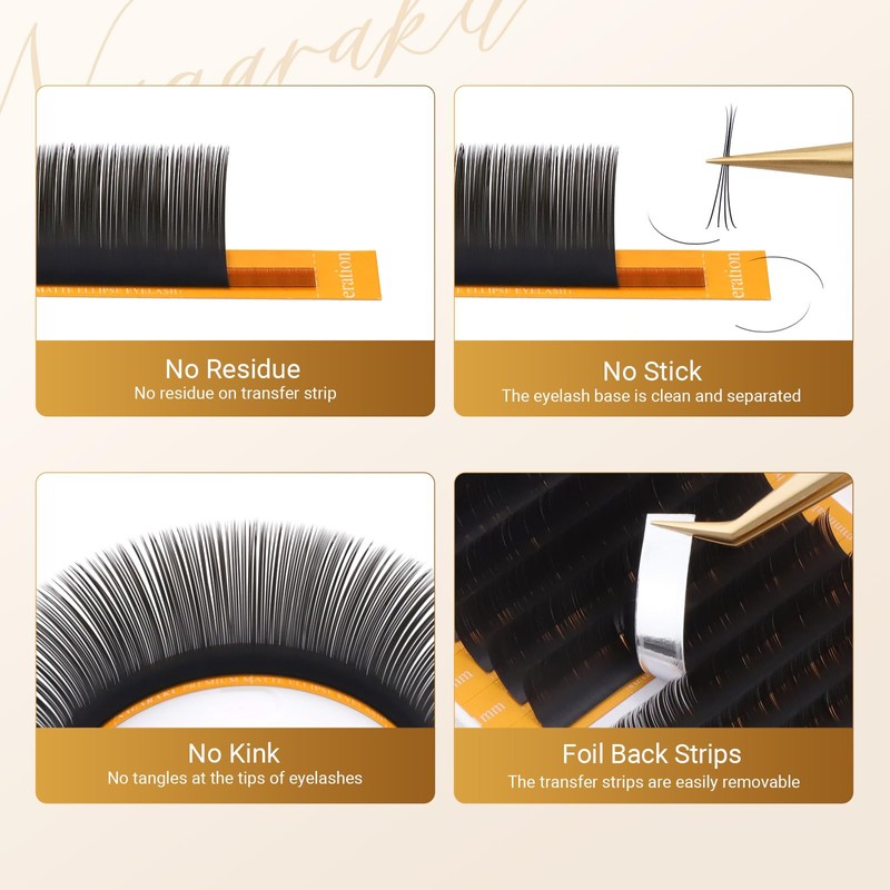 - UPGRADED 5TH GENERATION MATERIAL: the AIR series premium ellipse eyelashes are made of NAGARAKU's exclusive upgraded material and adopt a breakthrough air-flattened eyelash technology with grooves in the middle of the eyelashes, so the flat eyelashes are 33% lighter than 3 round classic eyelashes, softer, lighter, more natural and comfortable, suitable for professional salons. Matte black is purer and closer to natural eyelashes