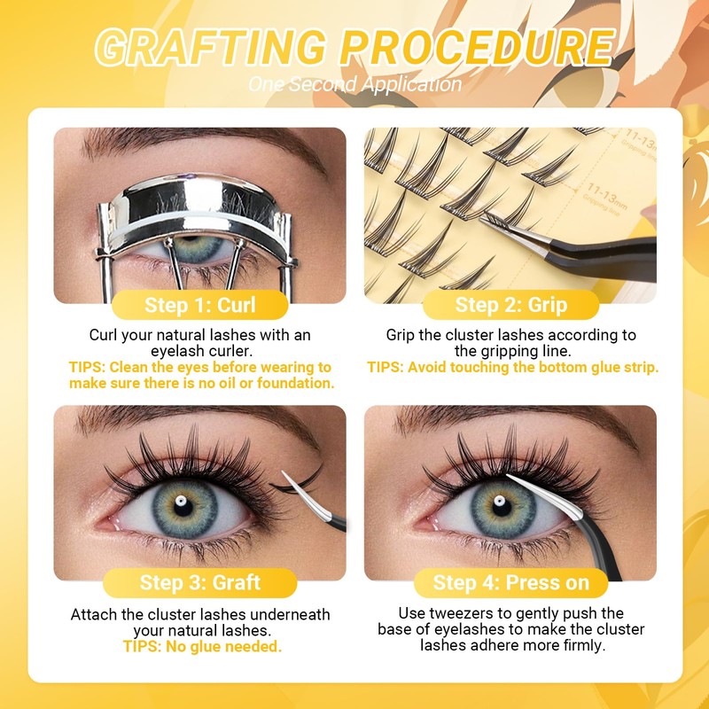 - Sin pegamento: No hay pegamento, sello ni ningún producto químico en contacto con las pestañas durante todo el proceso, es completamente seguro e inofensivo. Aplicación en un solo paso: simplemente use unas pinzas para colocar los grupos de pestañas debajo de sus pestañas naturales, lo que facilita la aplicación y le ahorra tiempo de maquillaje