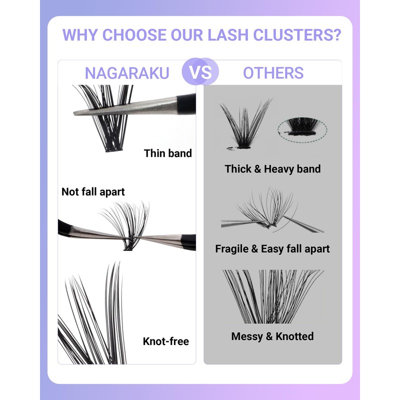 - Premium Cluster Lashes Fibers: NAGARAKU lash clusters are made with the finest updated PBT materials to ensure softness, thickness, durability and longevity, designed to give you fuller lashes that look more natural than traditional false eyelashes. The DIYlash clusters can be used 7-8 times with the proper care and cleaning.